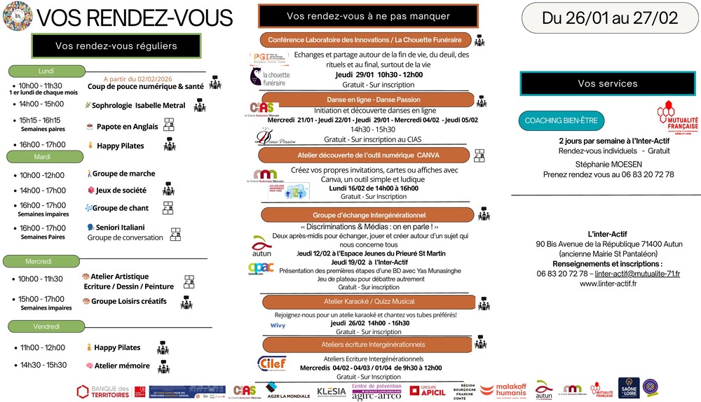 Un espace convivial pour se rencontrer, participer et animer des activités stimulantes.Des services et activités dédiés à votre bien-être et santé.La possibilité de devenir bénévole pour animer des activités.